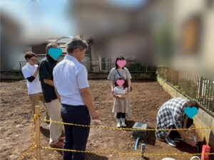 K様邸にて、四方祓いを執り行いました。 四方祓い(しほうばらい)とは、建物を建てる前に土地の四隅や中央を清めて、工事の安全やご家族の末永い幸せを祈る儀式です。 当日は、お施主様ご夫婦とお嬢様、そしてお父様にもご参加いただきました。