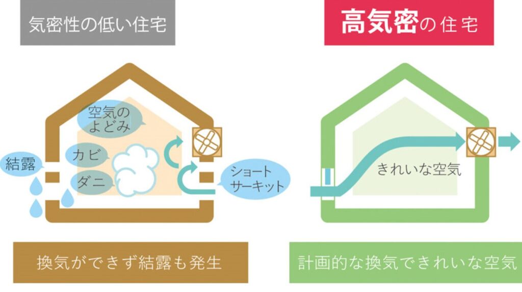 - 気密が低いと意図しない空気流入が起きて冷暖房効率が落ちる