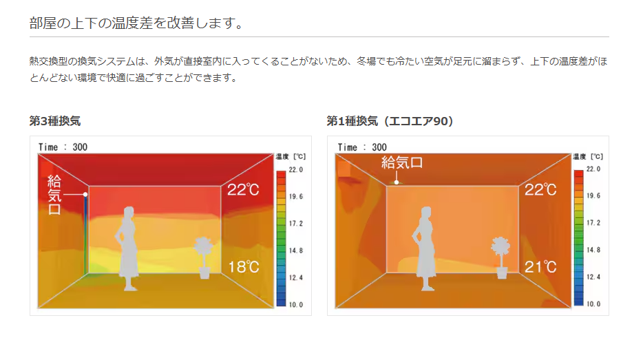 お家の内と外で温度差の少ない環境を作りながら、お家全体を90%以上換気をおこないます