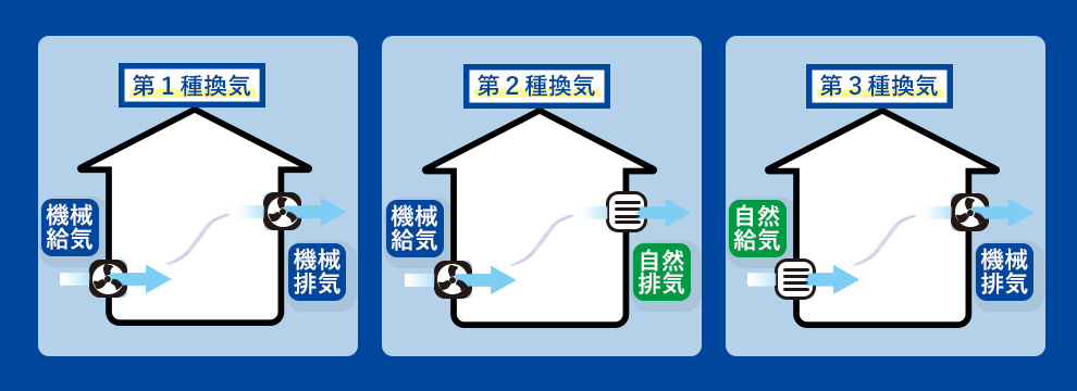 日本の住宅で義務化されている24時間換気は、給気(新鮮空気の取り込み)と排気(古い空気の排出)をどう行うかで「第1種〜第3種」に分類されます