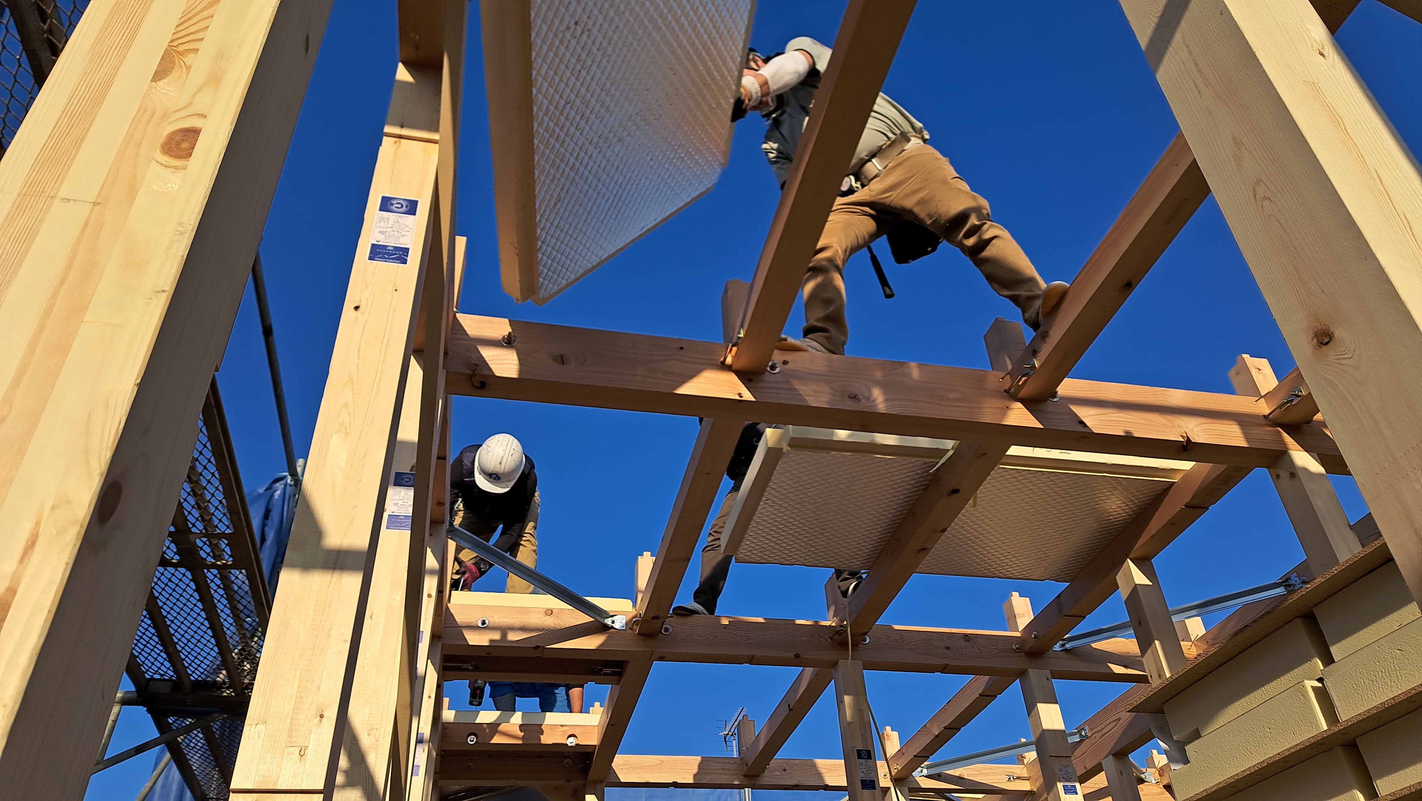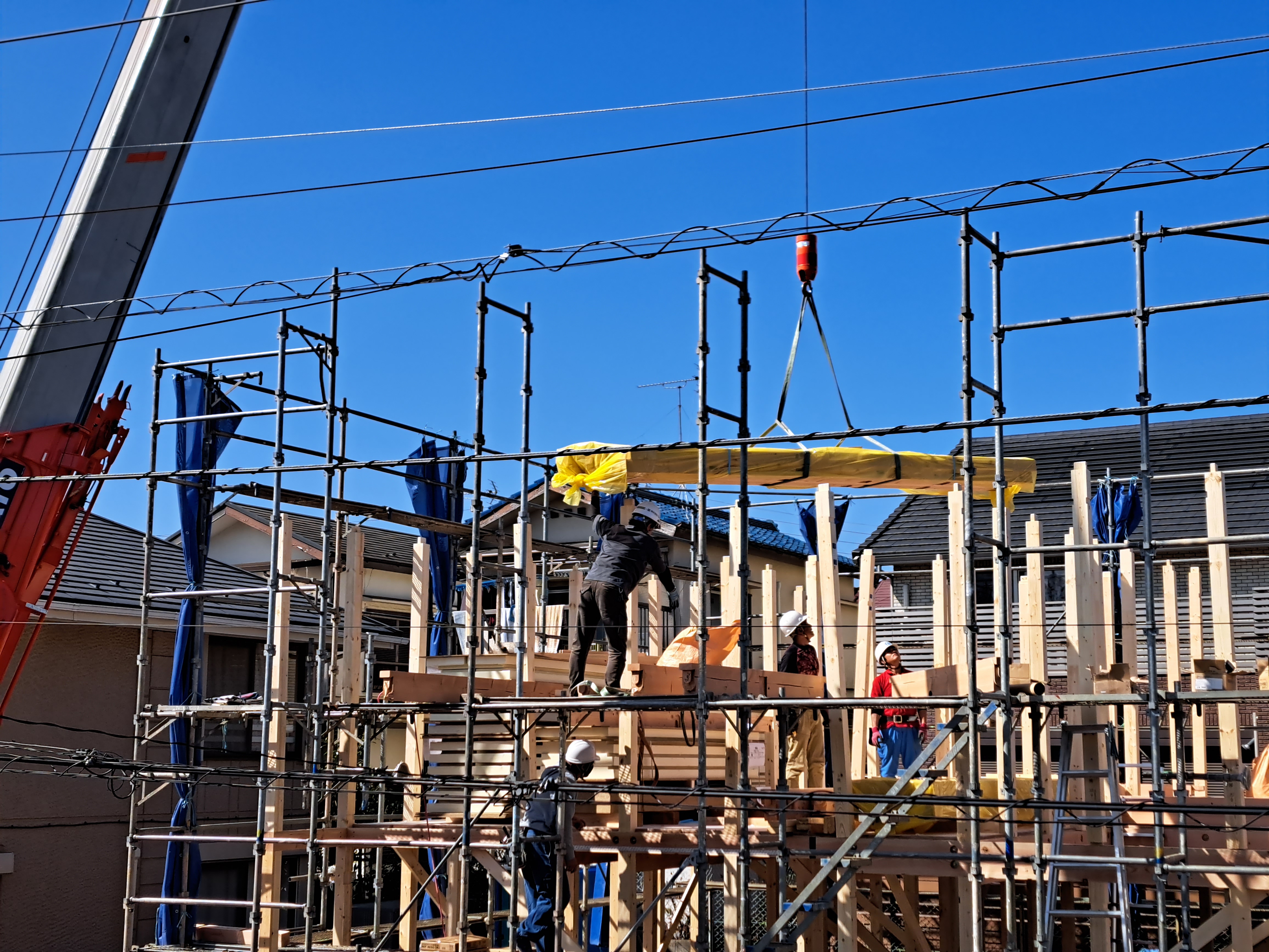 気持ち良い青空の下上棟日和となりましたS様邸。朝からたくさんの職人さんが 一気に棟上げしていく様は、家づくりの中でも圧巻の場面です。柱を立てて梁を渡し、床や天井を貼ってあっという間に骨組みが完成!高い所での作業も難なく進めていく職人さん達のスピーディで丁寧な仕事に、スタッフはいつも素晴らしいなぁと感動してしまいます。