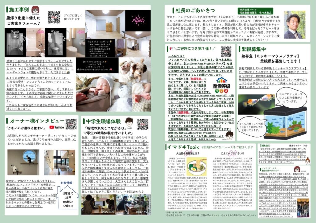 スタッフブログ 2026年02月19日ハルク通信『シン わくわくハウス2月号』ハルク通信2月号 イベント情報はこちら♪イベントreport♪☆オーナー様インタビュー☆☆中学生職場体験☆☆コラム第7弾☆◇施工事例◇Instagramでたくさんご紹介しています