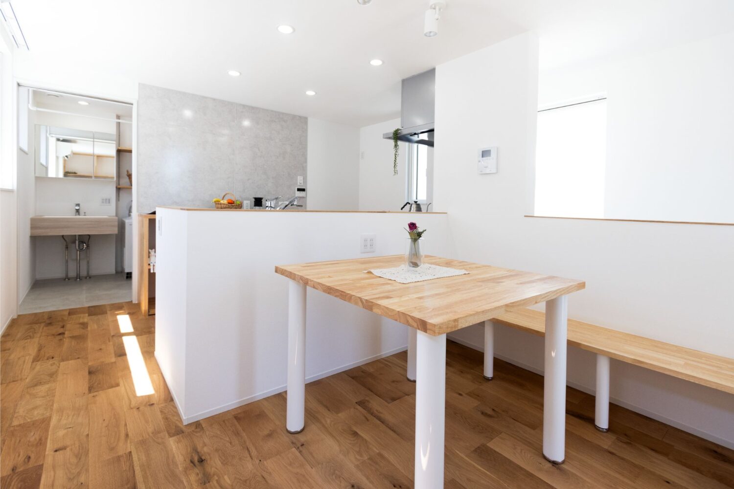 キッチンから洗濯物を置いたり、棚に置いたタオルを取ったりすることが出来る隙間です。絶妙な場所に設置されているので、キッチンから脱衣室の人は見えません。少しの工夫とアイディアで家事も楽になります。
