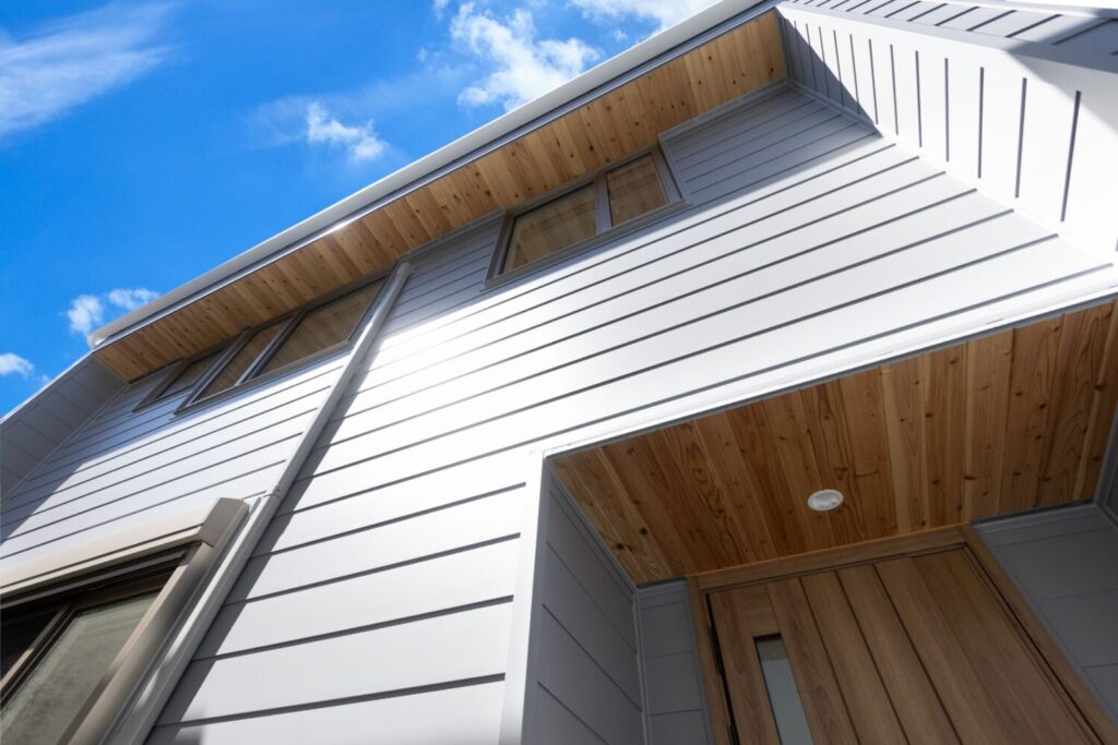 通り側の外壁には落ち着いたヘーゼルブラウンを、玄関側には爽やかなブルーグレーを採用し、角度によって異なる表情を楽しめる外観に仕上げました。玄関ドアには温もりを感じるチェリーウッドを合わせ、ナチュラルで上質な雰囲気を演出。色彩のコントラストと素材感が美しく調和した、魅力あふれるデザインです。