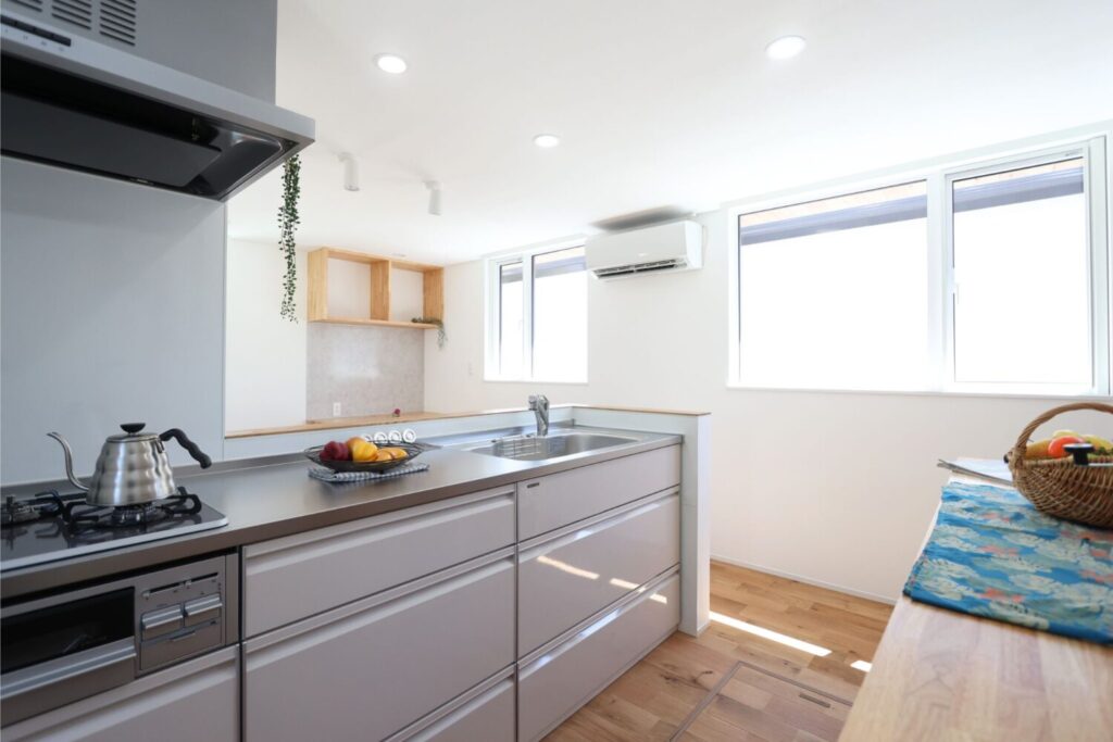 グレーのアクセントウォールとシルバーのレンジフードが空間を引き締め、細部までこだわり抜いたモダン・ナチュラルなキッチンを実現しました。