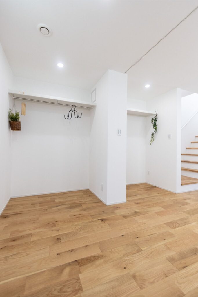 扉の開閉スペースが不要なため、家具の配置も自由自在です。白で統一された収納部と、温かみのある無垢フローリングの対比が美しく、清潔感あふれる寝室空間です。