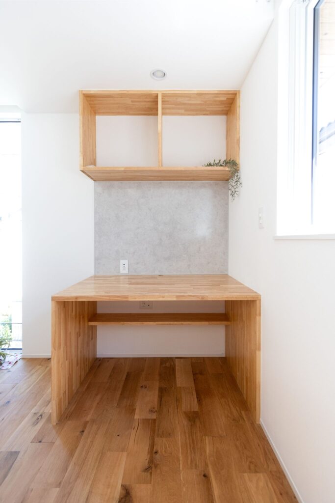 壁面のコンセント配置や、足元の棚板など、実用的なディテールにも配慮。窓からの自然光が手元を明るく照らす、理想的なスタディコーナーです。
