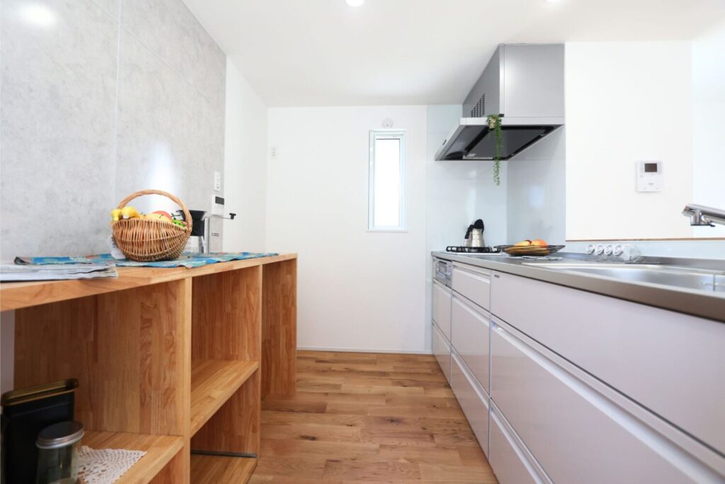 明るいシステムキッチンと、ぬくもりある無垢の床が光を反射し、お部屋全体をより一層広く、明るく演出しています。