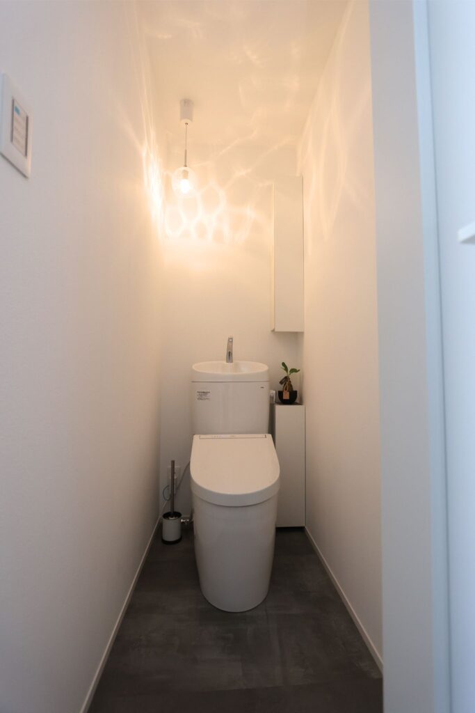 背面の縦長収納ですっきりとした機能性を確保しつつ、ペンダントライトによるライティングで空間に奥行きと表情を与えました。光の反射を計算したミニマルな内装設計が、上質なリラックスタイムを叶えます。