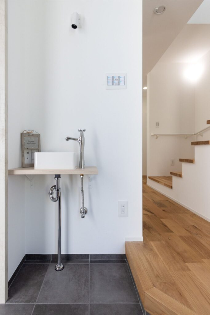 玄関を入ってすぐ、土間の上に設けられたコンパクトな手洗いスペース。