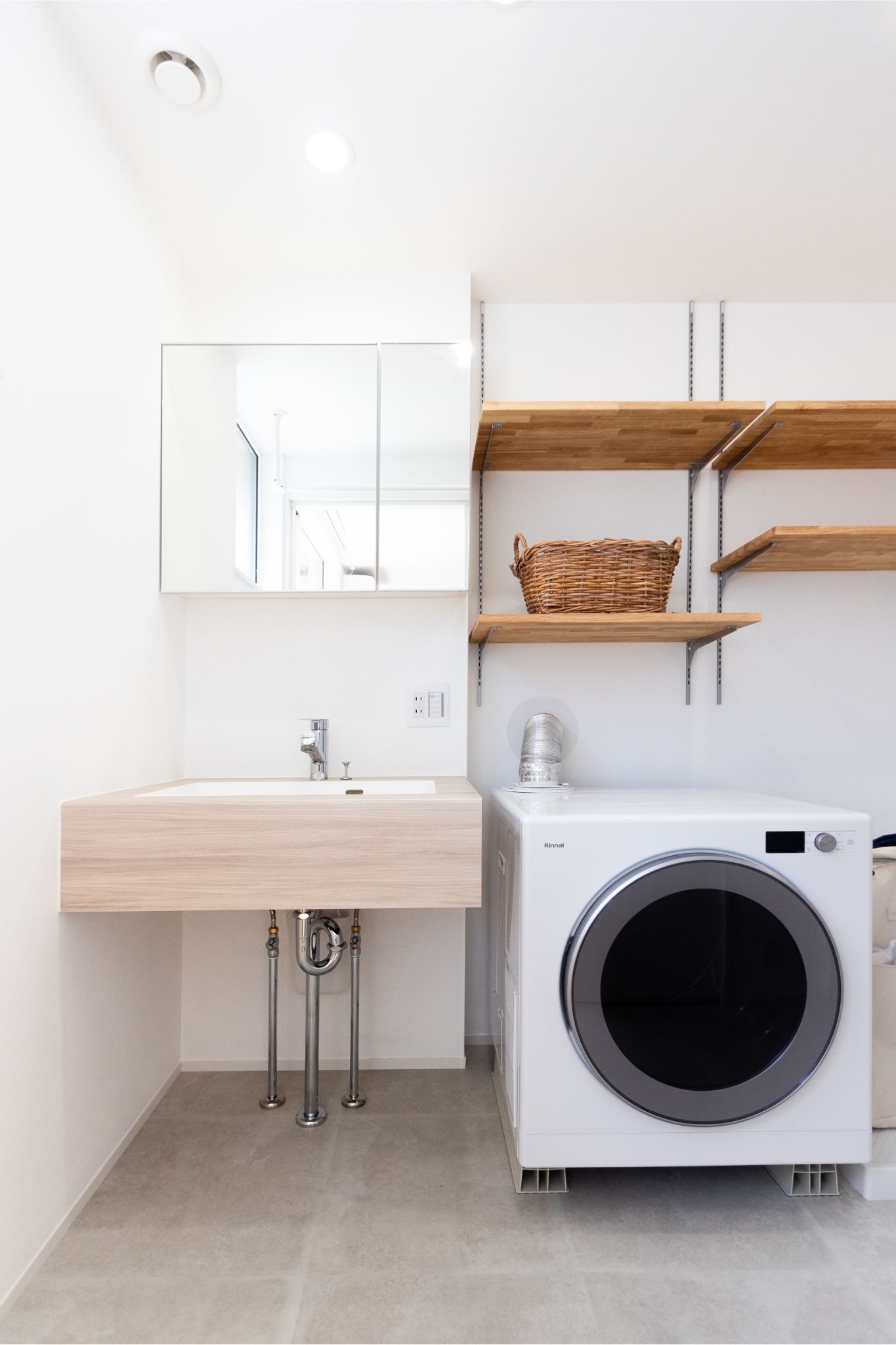隣には洗濯機スペースと、高さを自由に変えられる可動式の木製棚を設置。あえて扉を設けないオープンな収納は、家事の動線をスムーズにするだけでなく、お気に入りのカゴやリネンを並べて「見せる収納」を楽しむゆとりも生んでくれます。