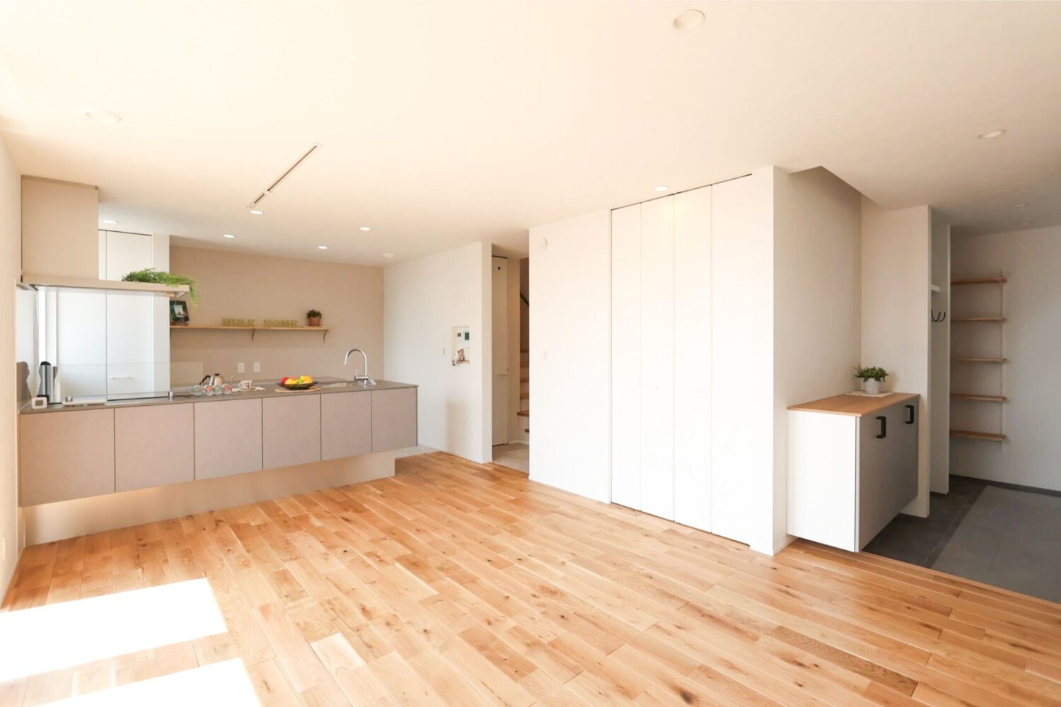 玄関ドアを開けると、外観の印象とは一転、やわらかなナチュラルテイストの空間が広がります。
