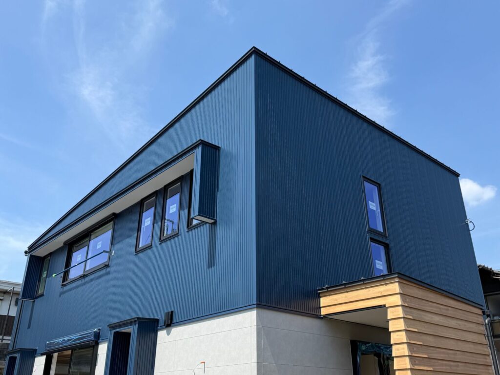 グランブルーのガルバリウム鋼板に、ナチュラルウッドのラップサイディングを組み合わせた外観。