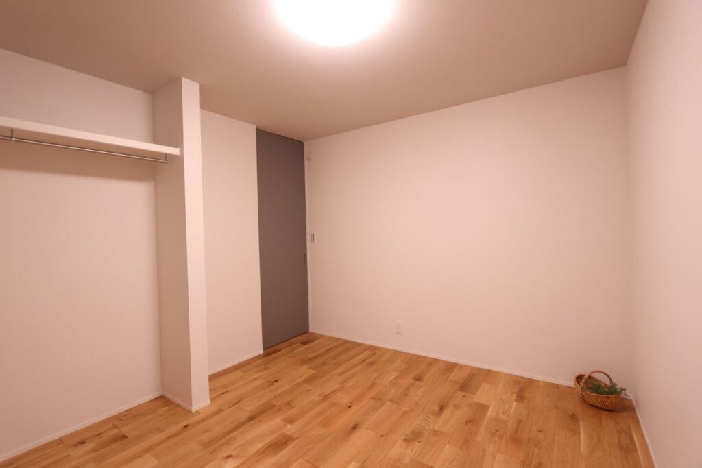 主寝室には落ち着いた色味のクロスを採用し、ゆったりとくつろげる空間に仕上げました。ファミリークローゼットを設けているため、主寝室内の収納は最小限に抑え、すっきりとした印象を大切にしています。
