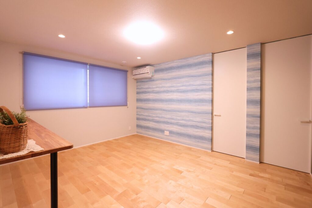 アクセントクロスとロールスクリーンの色味をそろえることで、空間全体に統一感を持たせています。色数を抑えることで、落ち着きのあるすっきりとした印象に仕上げました。
