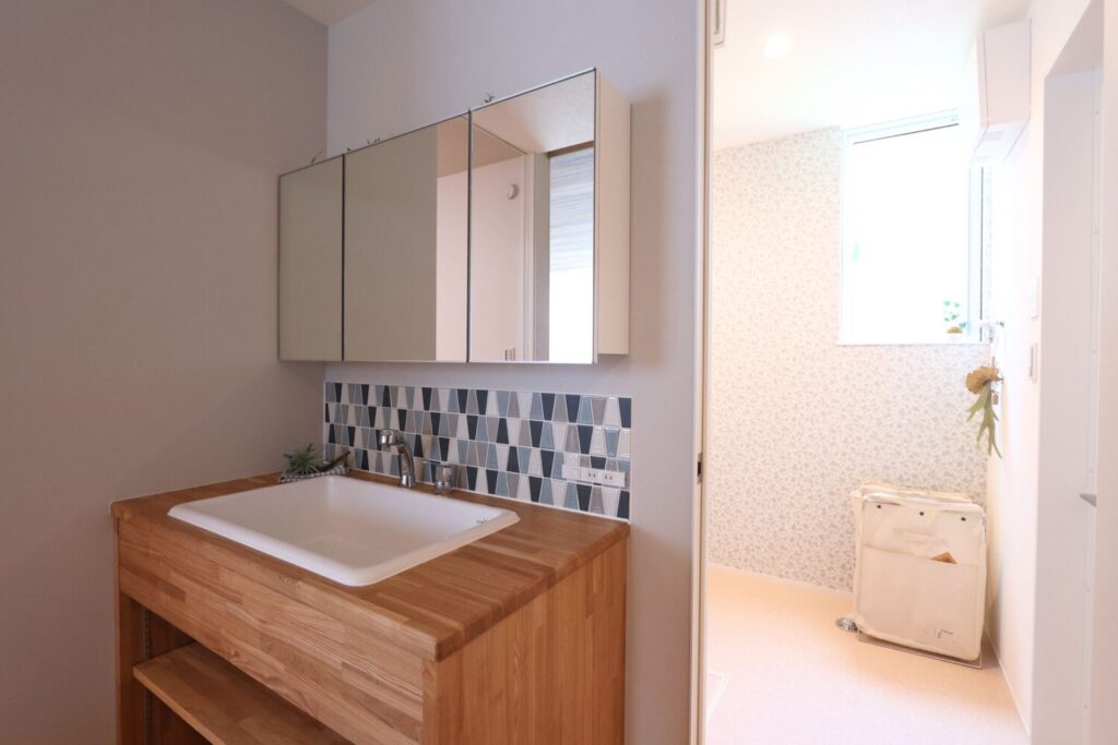 タイルを取り入れて個性を演出した造作洗面台は、空間のアクセントにもなるデザインです。木の素材感を生かすことで、ナチュラルであたたかみのある印象に仕上げました。毎日使う場所だからこそ、見た目と使い心地の両方にこだわっています。