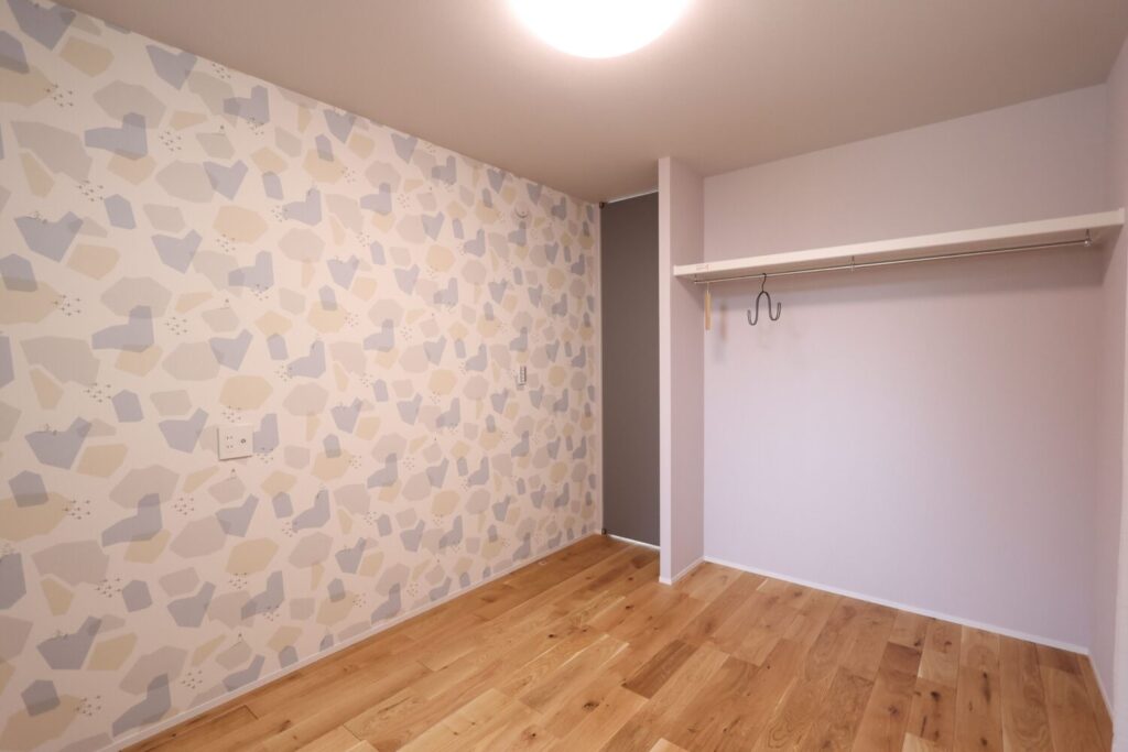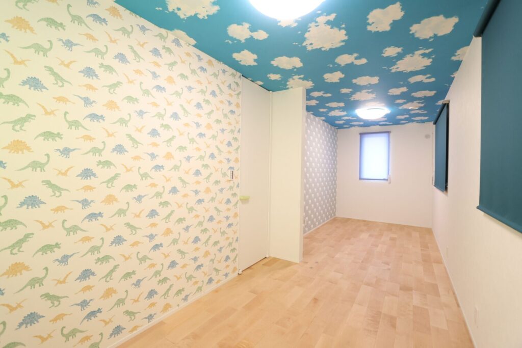 明るく元気いっぱいの印象の子ども部屋は、子どもらしいクロスを採用し、ポップで楽しい雰囲気に仕上げました。