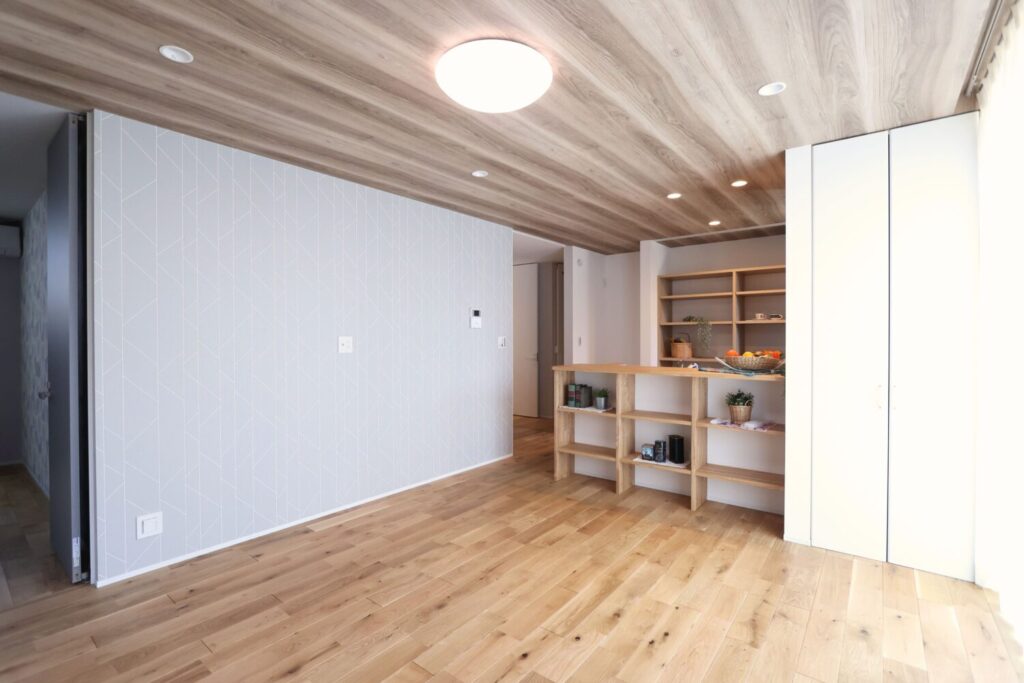 無垢の床材と天井の木目調クロスが、空間全体にナチュラルで落ち着いた雰囲気をもたらしています。