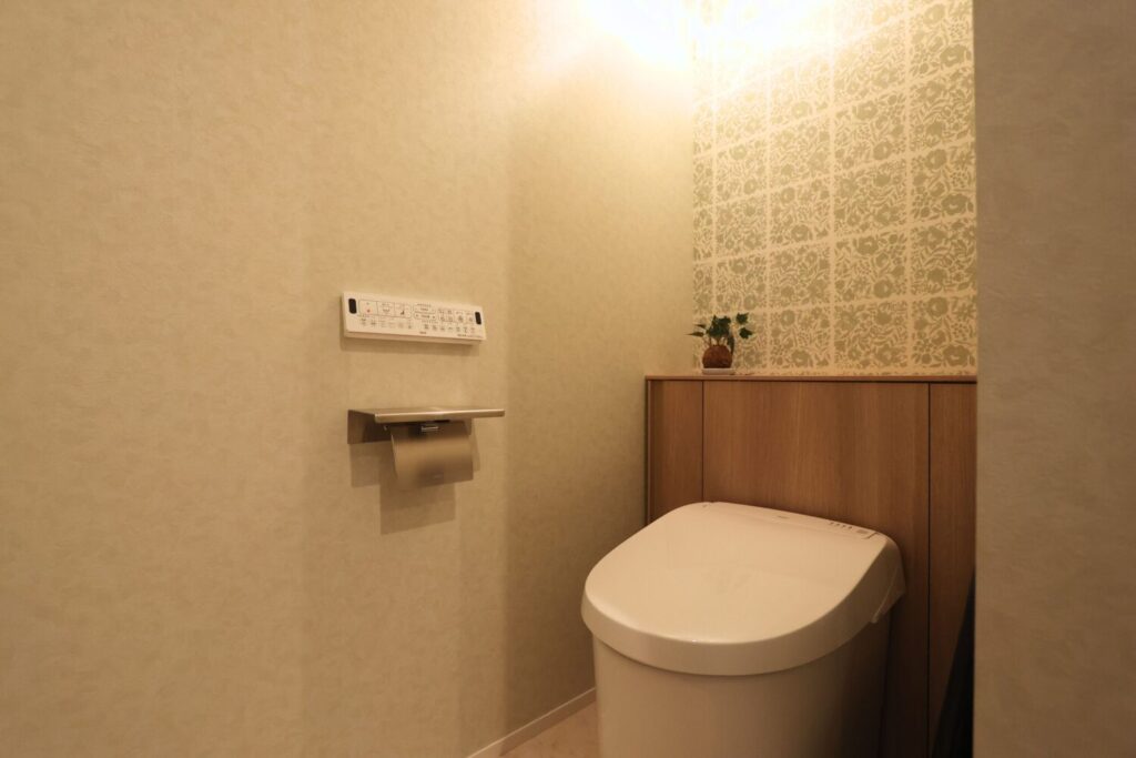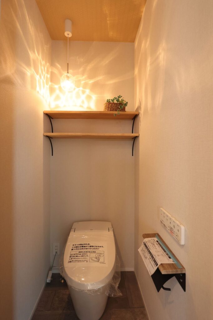 落ち着いた雰囲気でまとめた1階トイレ。収納スペースを確保することで、必要な物をすっきりとしまえ、清潔感のある空間を保てます。