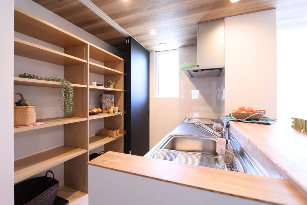 大家族の毎日の食事づくりを支える、ゆとりあるキッチン。複数人での調理もしやすい動線と作業スペースを確保し、忙しい時間帯でもスムーズに使えるよう計画しました。天井まである背面収納は収納力も抜群で、調理器具や食器、ストック品までしっかり収まります。来客時など生活感を抑えたい場面では、引戸を閉めることで空間をすっきりと見せられるのも魅力です。