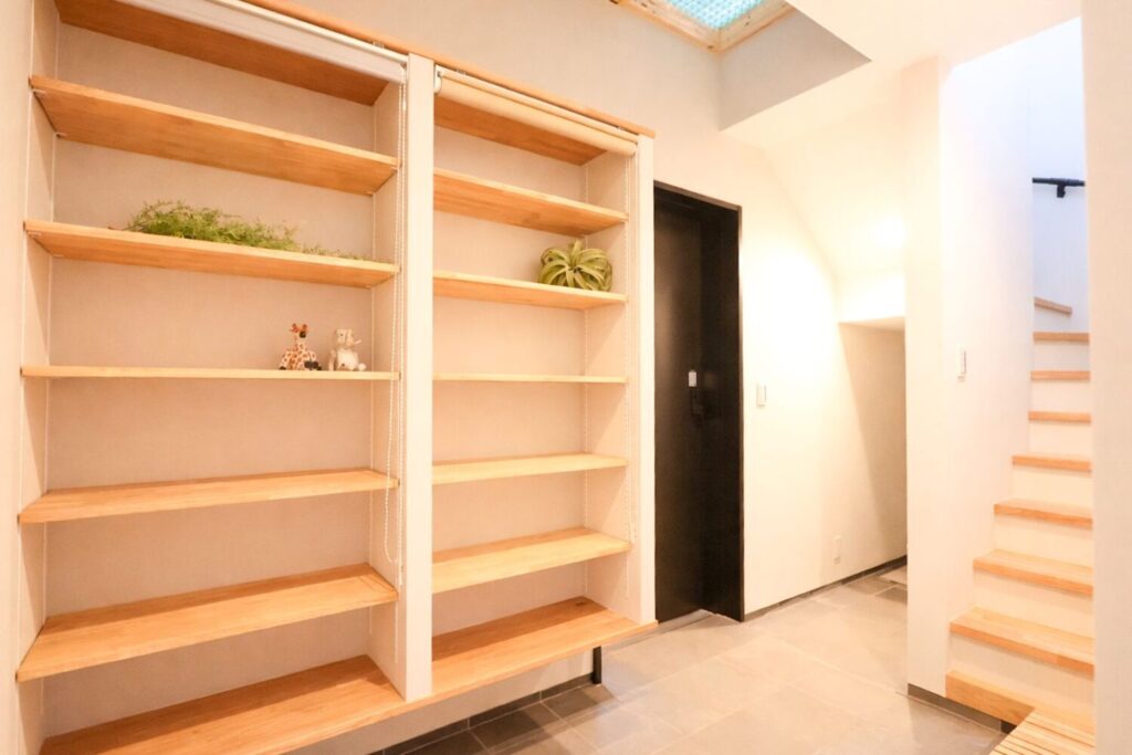 広い土間と大容量の造作棚を備え、玄関まわりはいつもすっきりとした印象に。天井にはグレーチングを採用し、光を取り込むことで、暗くなりがちな玄関も明るく開放的な空間に仕上げました。